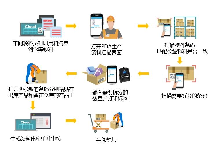 ● 提高拣货效率:在出库领料时,客户可在扫描过程中直接使用便携式打印机打印拆分标签或补打原标签,极大简化流程,提升拣货效率。