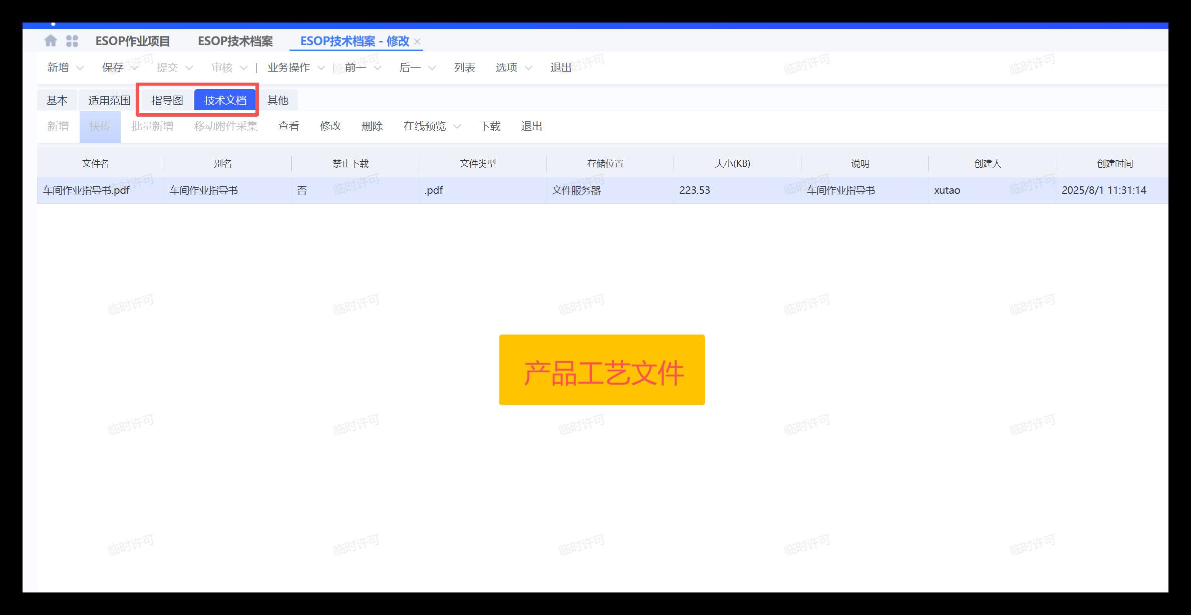 ESOP 工艺文件可绑定具体物料与工序,确保操作标准与生产流程严格匹配。